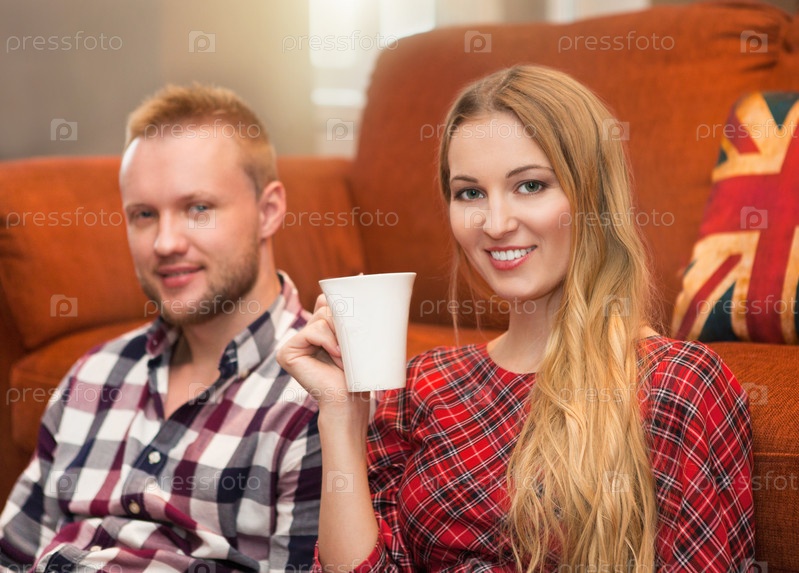 Пара пьет кофе в гостиной