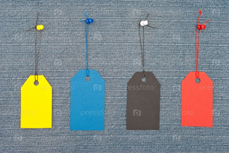 Разноцветные пустые ценники на джинсовом фоне