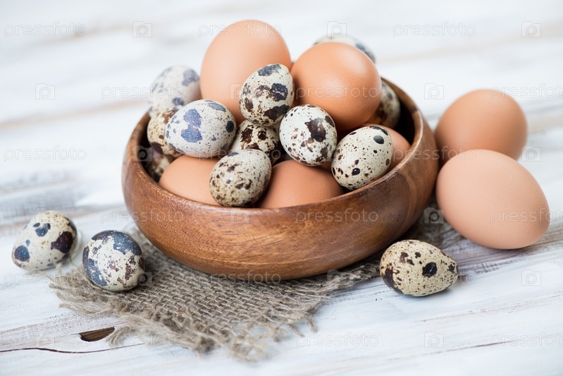 Сырые перепелиные и куриные яйца