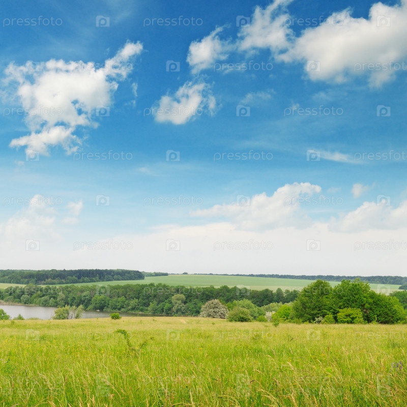Зеленое поле и голубое облачное небо