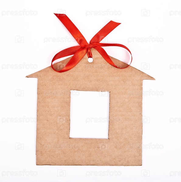 Картонный домик с красной лентой, изолированный на белом фоне