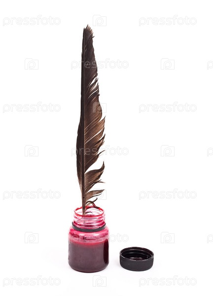 Чернильница с пером на белом фоне