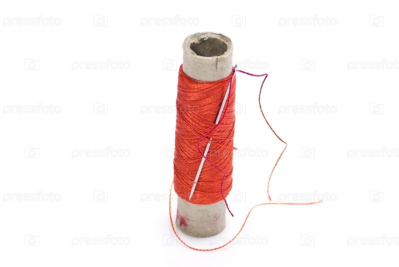 Катушка ниток с иголкой на белом фоне