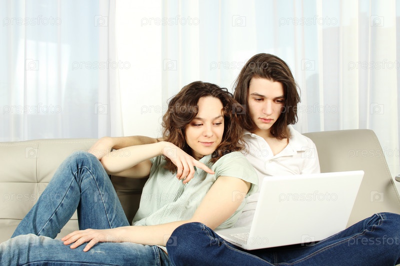 Привлекательная молодая пара сидит на диване с ноутбуком