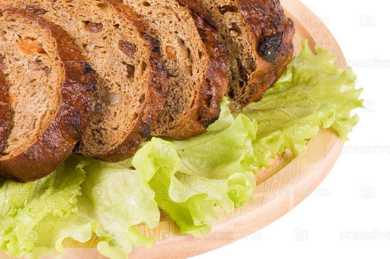 Ломтики ржаного хлеба с листьями салата на белом фоне