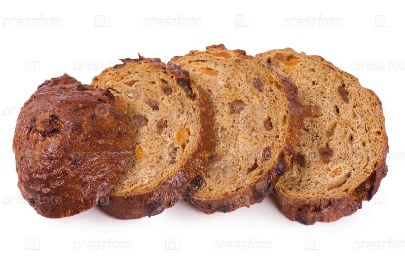 Ломтики ржаного хлеба с изюмом на белом фоне