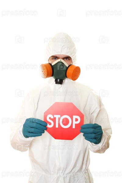 Человек в защитном костюме и респираторе держит знак STOP на белом фоне