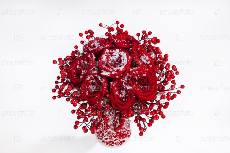 Декоративная композиция из цветов и ягод на белом фоне