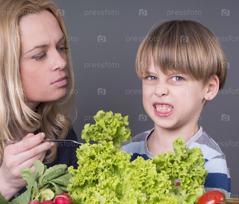 Мать пытается кормить сына здоровой едой