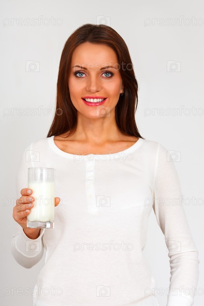 Женщина со стаканом молока на белом фоне