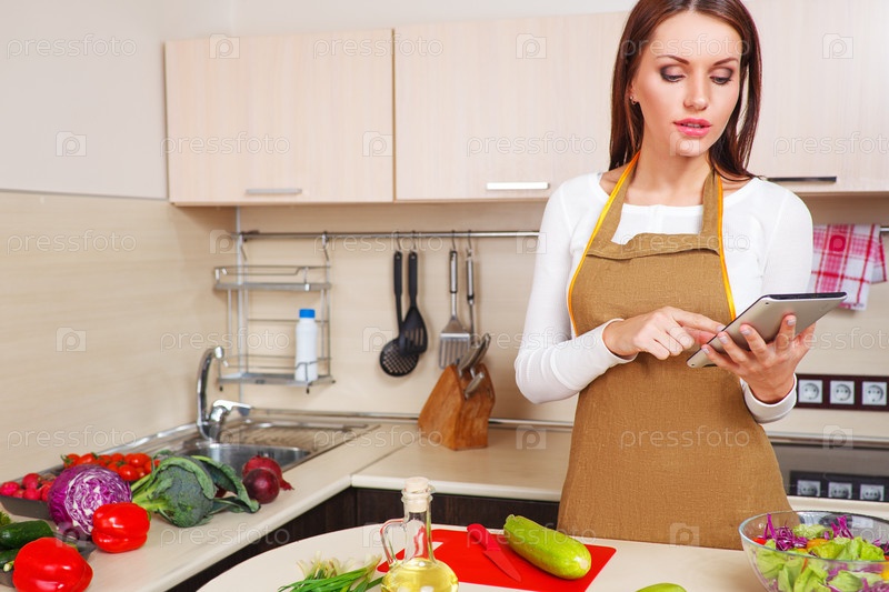 Женщина с планшетным компьютером на кухне