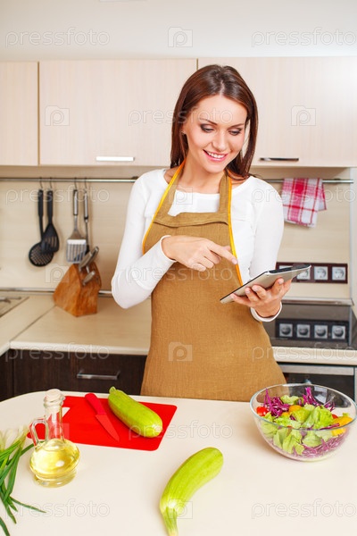 Женщина с планшетным компьютером на кухне