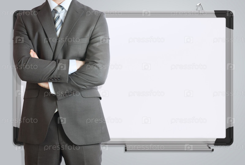 Человек в костюме на фоне баннера