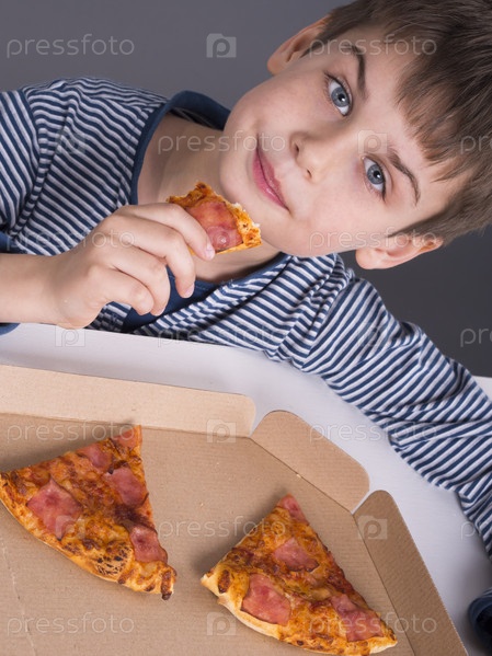 Мальчик ест пиццу