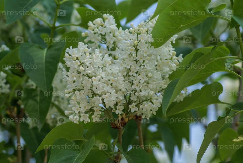 Веточка белой сирени на кусту
