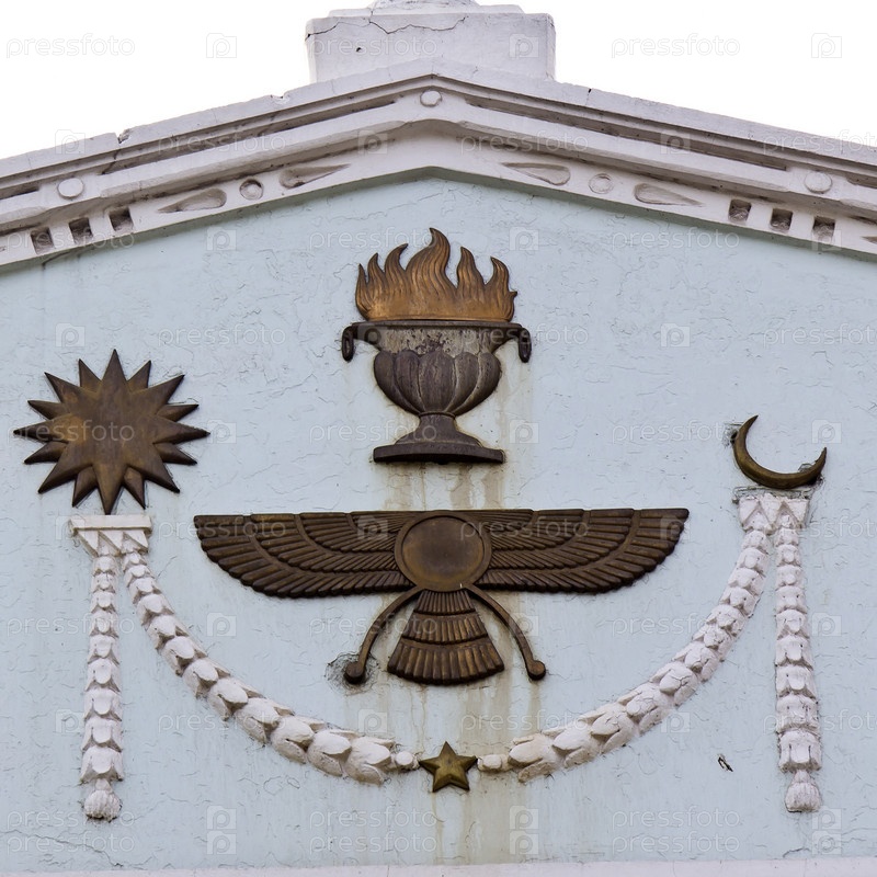 Зороастрийская символика на стене храма этой древней религии. Ахмадабад, Гуджарат