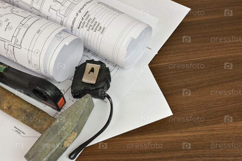 Строительные чертежи на деревянной поверхности
