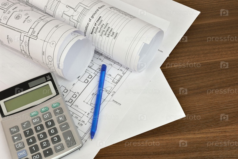 Строительные чертежи на деревянной поверхности