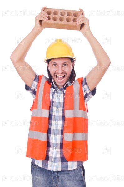Строитель с кирпичом, изолированный на белом