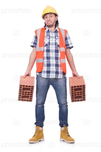 Строитель с кирпичом, изолированный на белом фоне
