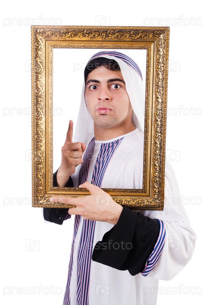 Араб с фоторамкой на белом фоне