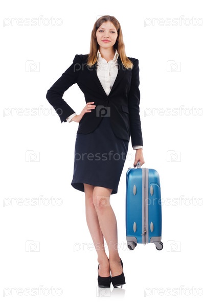 Женщина с чемоданом на белом фоне