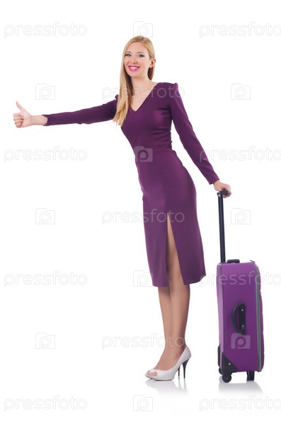 Женщина с чемоданом на белом фоне