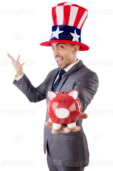 Мужчина в американской шляпе с копилкой