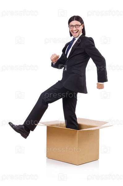 Забавный человек с коробкой на белом фоне