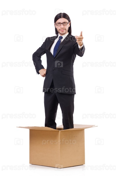 Забавный человек с коробкой на белом фоне