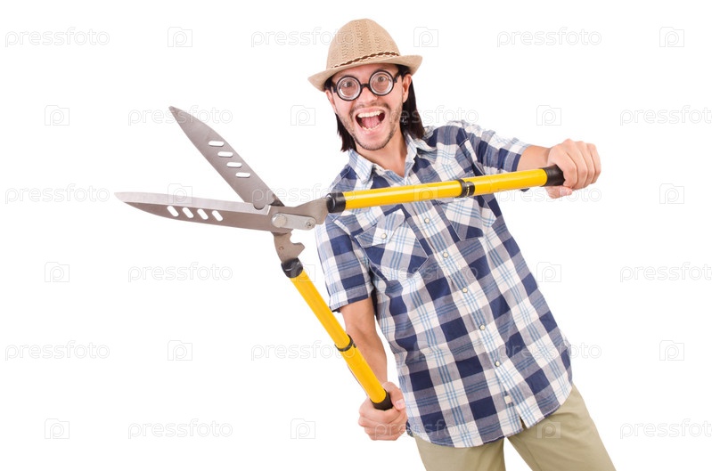 Забавный парень с садовыми ножницами на белом фоне