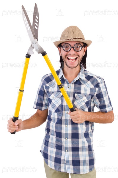 Забавный парень с садовыми ножницами на белом фоне