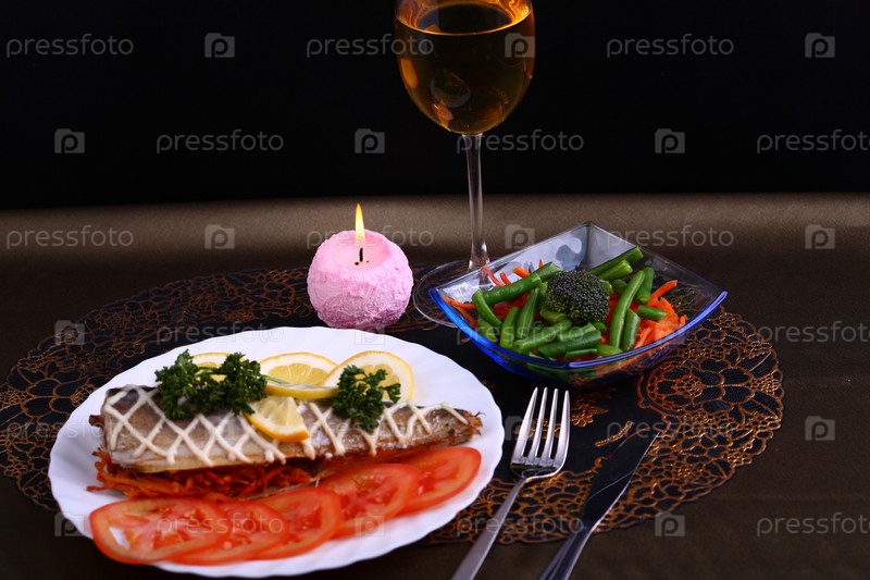 Красиво сервированный стол с овощным салатом и рыбным блюдом