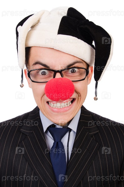 Бизнесмен в клоунском колпаке, изолированный на белом фоне