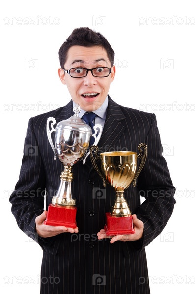 Забавный парень получает награду на белом фоне