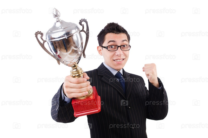 Забавный парень получает награду на белом фоне