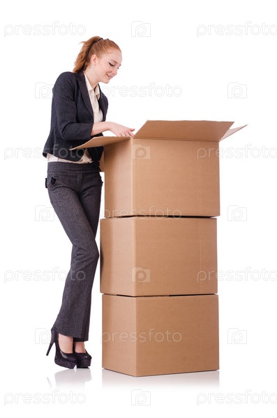 Бизнес-леди с коробками на белом фоне