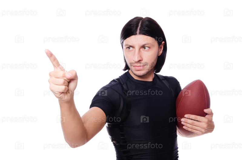 Мужчина с мячом для американского футбола на белом фоне