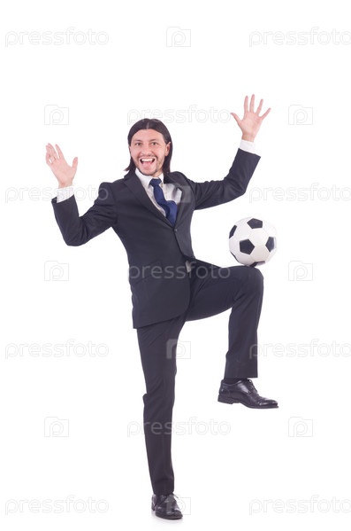 Мужчина с футбольным мячом, изолированный на белом фоне