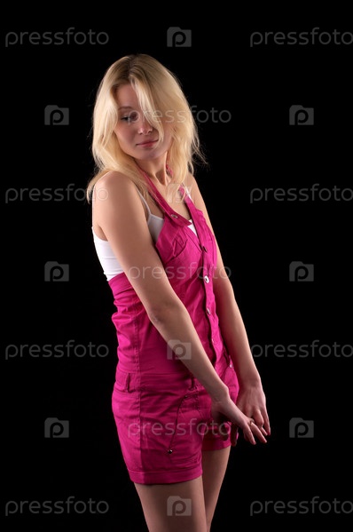 Девушка в розовом комбинезоне на черном фоне