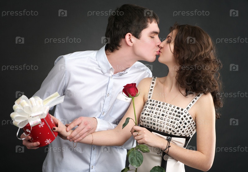 Девушка дарит подарок молодому человеку на черном фоне