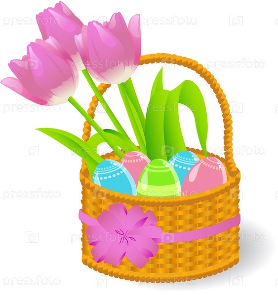 Корзинка с пасхальными яйцами и тюльпанами на белом фоне