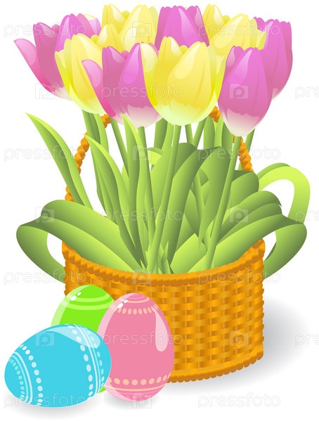 Корзинка с тюльпанами и пасхальные яйца на белом фоне