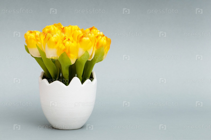 Желтые тюльпаны в горшке на сером фоне