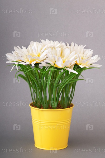 Белые герберы в ведре на сером фоне