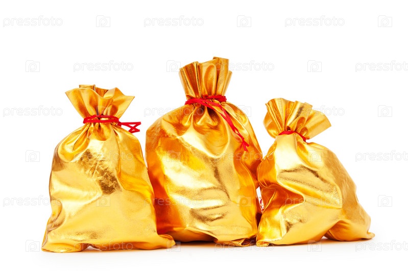 Золотые мешки с подарками на белом фоне