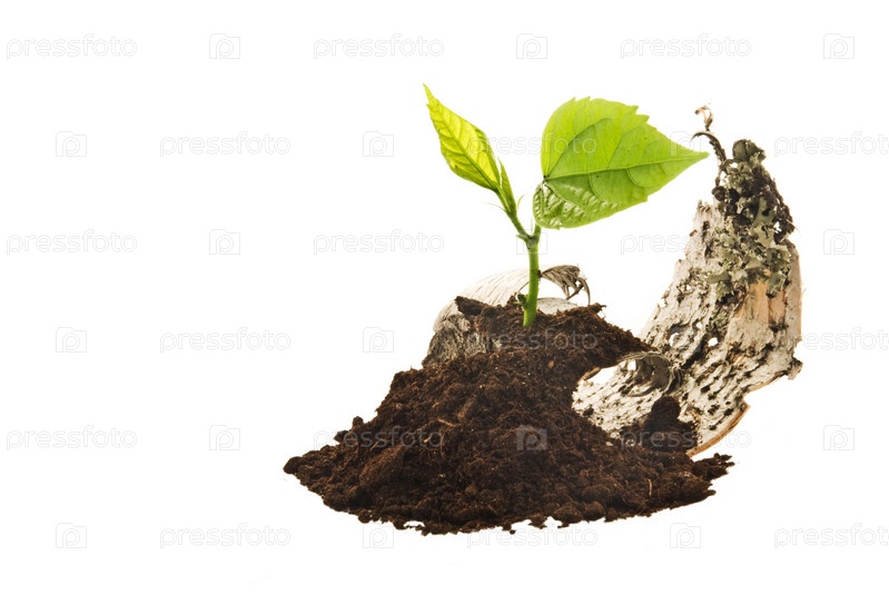 Молодой зеленый росток в земле на белом фоне