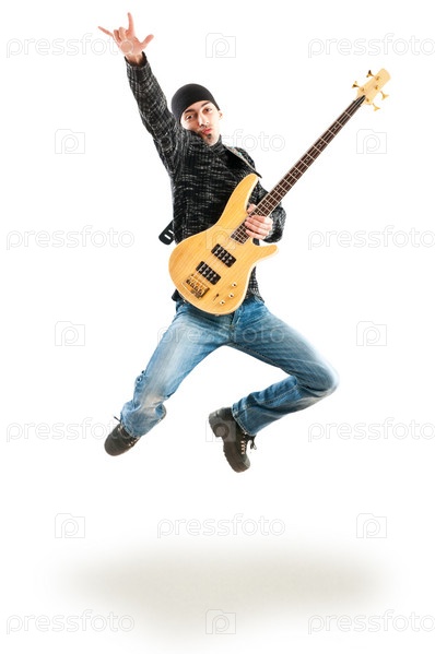 Гитарист подпрыгнул в воздухе на белом фоне