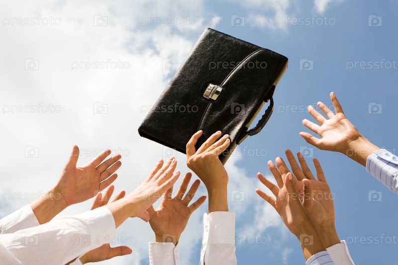 Близкий план бизнесмена с портфелем в руке, окруженного руками других людей