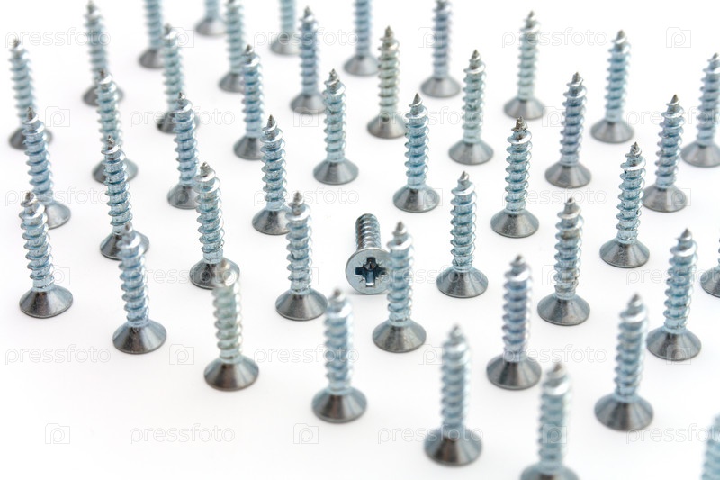 Некоторые винты на белом фоне. Эффект перспективы. В центре лежит один винт. Один был выделен из общего числа идентичных